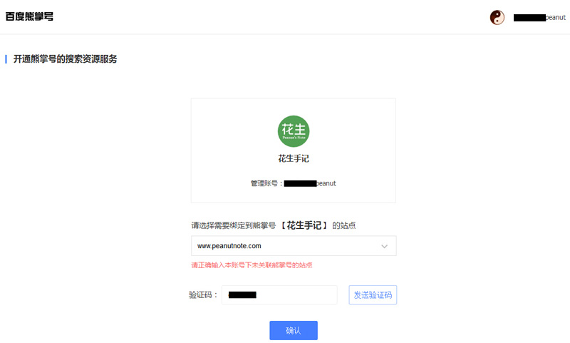 這里有一點要提醒各位,在添加熊掌號的時候一定不能把名稱和站點鏈接寫錯了,因為提交之后是不能修改的?;ㄉ褪且驗橐粫r疏忽,誤把“花生手記”這個名稱綁了www.360hudong.com這個域名(原本是打算綁www.peanutnote.com這個域名的),后面重新提交了幾次也沒有改過來。