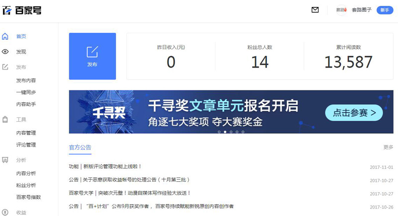 點擊百家號平臺可以直接跳轉(zhuǎn)到百度賬號對應的百家號后臺