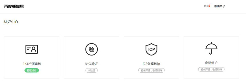 如果你是通過企業(yè)認證的百家號進入的百度熊掌號后臺,進入認證中心后,是可以選擇其他認證方式的,目前開放的認證方式有兩種,分別是主體資質(zhì)審核和對公驗證。