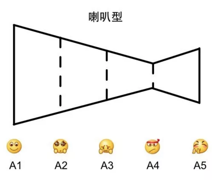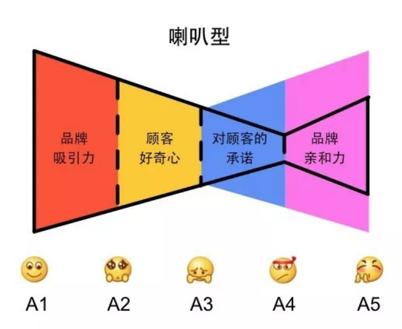喇叭型從A1到A3都是完美的,當然奢侈品大部分只針對小眾市場,所以最后進入到A4階段的人并不多。但是可以通過擴展通路來增加品牌承諾,讓對品牌擁護程度高,卻并沒有購買的粉絲下決心購買。也可以通過增加售后服務責任,提升奢侈品在品質(zhì)和耐久性上的聲譽,讓有消費力但并沒有購買的顧客,改變對奢侈品的看法。