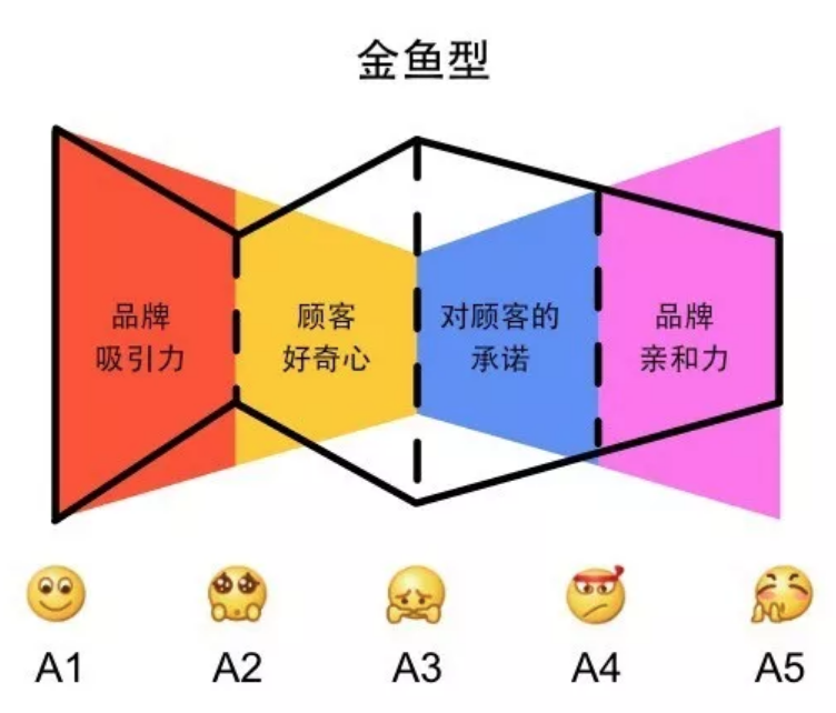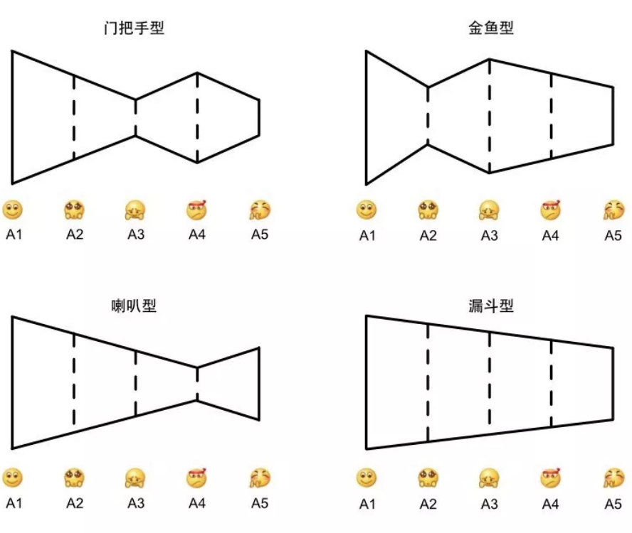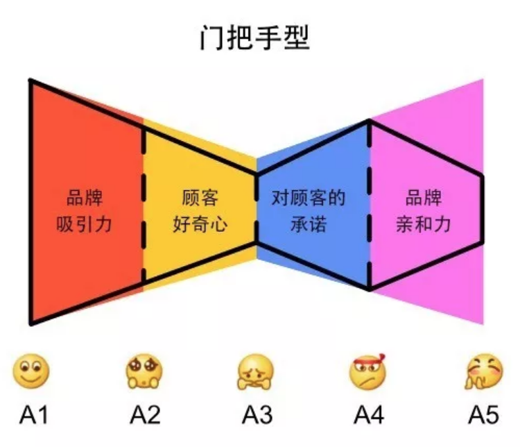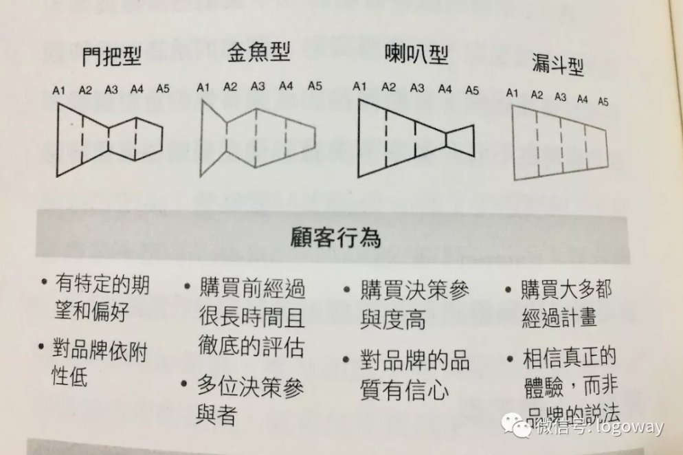 很巧,拿起書就翻到了一張從未見過的圖。針對數(shù)字時代,科特勒新提出了四種顧客體驗模型,門把手型、金魚型、喇叭型、漏斗型。而每一種模式由5個A組成。