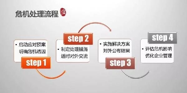 危機公關(guān)是一項系統(tǒng)工程,它包含對危機事前、事中、事后所有方面的管理。危機公關(guān)的目的在于預(yù)防、擺脫、轉(zhuǎn)化危機,避免或減少企業(yè)損失,維護企業(yè)的正常運營和良好的企業(yè)形象。就整體而言危機處理流程可分為四步,具體如下: