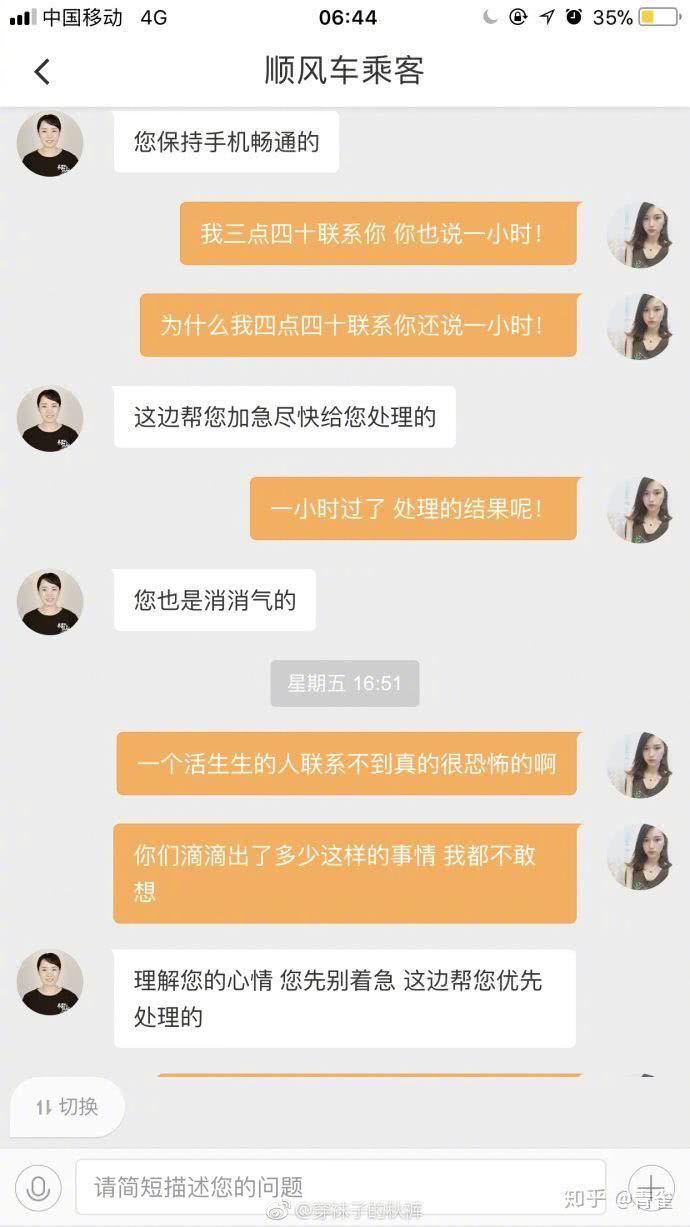 據(jù)受害人據(jù)趙某的一位老友介紹,事發(fā)當(dāng)天從下午3點42分,他打電話給滴滴渠道求助,希望得到順風(fēng)車司機(jī)的信息。由于工作很緊迫,在1小時內(nèi),他7次向滴滴渠道承認(rèn)工作的進(jìn)展,但滴滴的回復(fù)十分格式化、機(jī)械化。重復(fù)回復(fù)“一線客服沒有權(quán)限”、“在這里請您耐性等候,您的反應(yīng)咱們會為您加急標(biāo)紅”。
