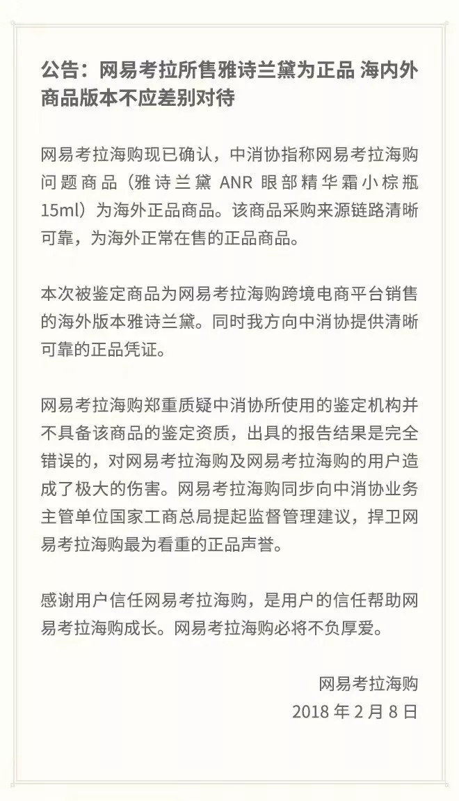 再比如今年的網(wǎng)易考拉,中消協(xié)發(fā)布的2017“雙11”網(wǎng)絡(luò)購物調(diào)查體驗結(jié)果中,京東、聚美優(yōu)品、網(wǎng)易考拉、蜜芽、拼多多等電商平臺全部中槍,被調(diào)查出“海淘售假”。然而網(wǎng)易考拉率先進(jìn)行了強(qiáng)勢回應(yīng)。發(fā)布了一條聲明,指出所謂的“問題商品”均為海外正品且采購來源鏈路清晰可靠。并且“鄭重質(zhì)疑中消協(xié)所使用的鑒定機(jī)構(gòu)不具備該商品的鑒定資質(zhì)。”整個回應(yīng)相對強(qiáng)勢。這一事件最新的結(jié)果是,今年6月,網(wǎng)易考拉起訴中消協(xié)、雅詩蘭黛等侵犯名譽(yù)權(quán),要求賠償2100萬元,真是強(qiáng)勢中的強(qiáng)勢。