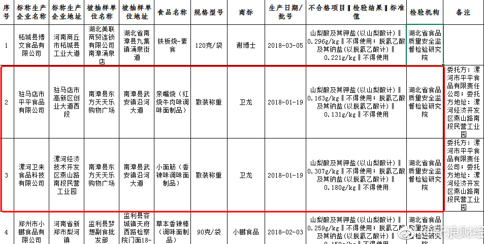 事情的起因是這樣的:8月30日,湖北省食品藥品監(jiān)督管理局發(fā)布食品安全監(jiān)督抽檢信息公告,在所抽檢的11類食品643批次中,抽樣檢驗項目合格樣品622批次,不合格樣品21批次。其中,包括衛(wèi)龍、謝博士、小鵬食品、香鐺鐺、鐘芹輝等多款“辣條”產(chǎn)品被檢出不合格。其中,衛(wèi)龍辣條被檢測出含有被要求不得使用的山梨酸及其鉀鹽、脫氫乙酸及其鈉鹽。