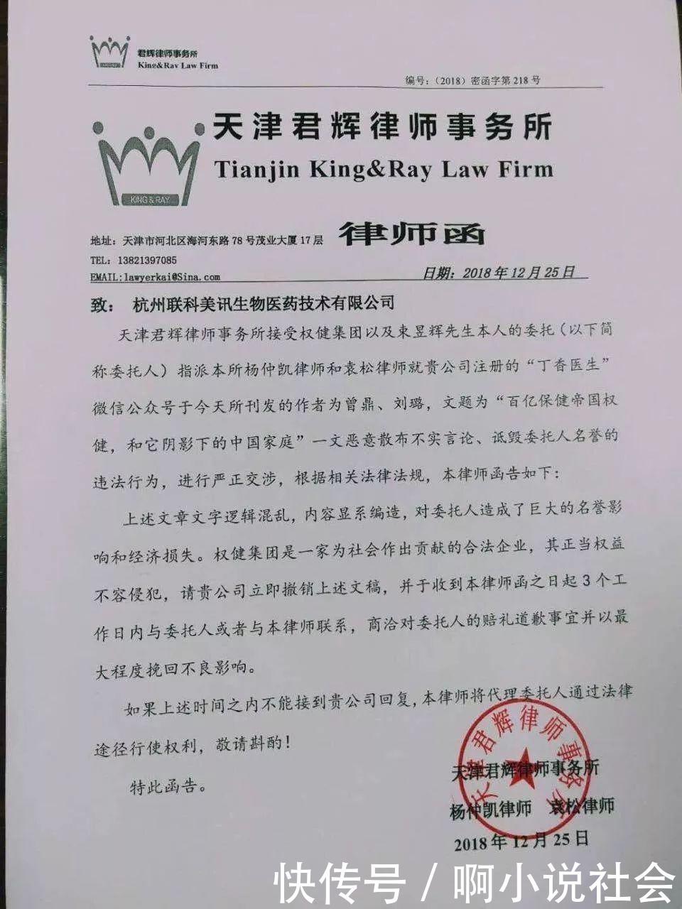 丁香醫(yī)生收到的權(quán)健公司律師函。 受訪者供圖