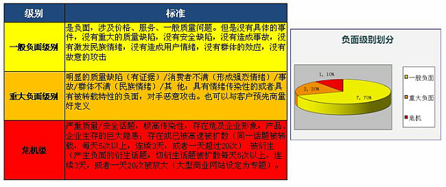 根據(jù)對消費者利益的影響程度(注意是以消費者立場為判斷依據(jù),而不是以企業(yè)主觀立場來判斷)將危機分為“情節(jié)甚微”、“情節(jié)輕微”、“情節(jié)嚴重”、“情節(jié)惡劣”四個等級,分別代表可能對企業(yè)產(chǎn)生影響的嚴重程度。