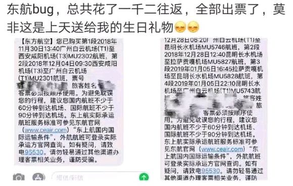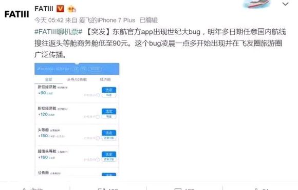 東方航空app今日(17日)凌晨突然出現(xiàn)大bug,多條國(guó)內(nèi)航線頭等艙商務(wù)艙往返機(jī)票,最低只需90元。據(jù)說這一bug在凌晨1點(diǎn)多時(shí)出現(xiàn),持續(xù)了幾個(gè)小時(shí)。網(wǎng)友也曬出自己的超低價(jià)機(jī)票訂單從微博網(wǎng)友截圖可以看出,在東航官網(wǎng)搜索往返機(jī)票信息,票價(jià)一樣低到驚人。針對(duì)17日凌晨在系統(tǒng)維護(hù)時(shí)售出的機(jī)票,東航發(fā)布公告表示已出機(jī)票全部有效,旅客可正常使用。