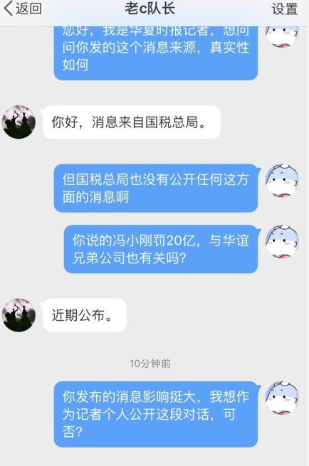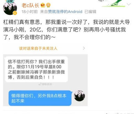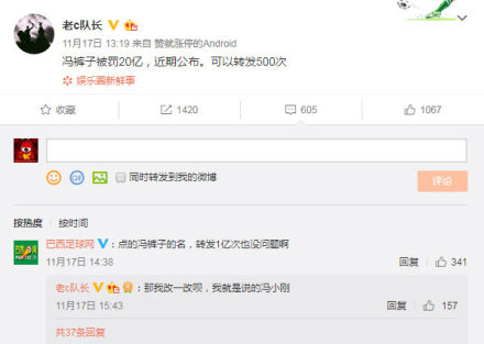 11月19日,認(rèn)證為“北京銀泰安投資顧問有限公司董事長(zhǎng)”的微博網(wǎng)友“老c隊(duì)長(zhǎng)”發(fā)微博稱:“馮褲子被罰20億,近期公布??梢赞D(zhuǎn)發(fā)500次。”