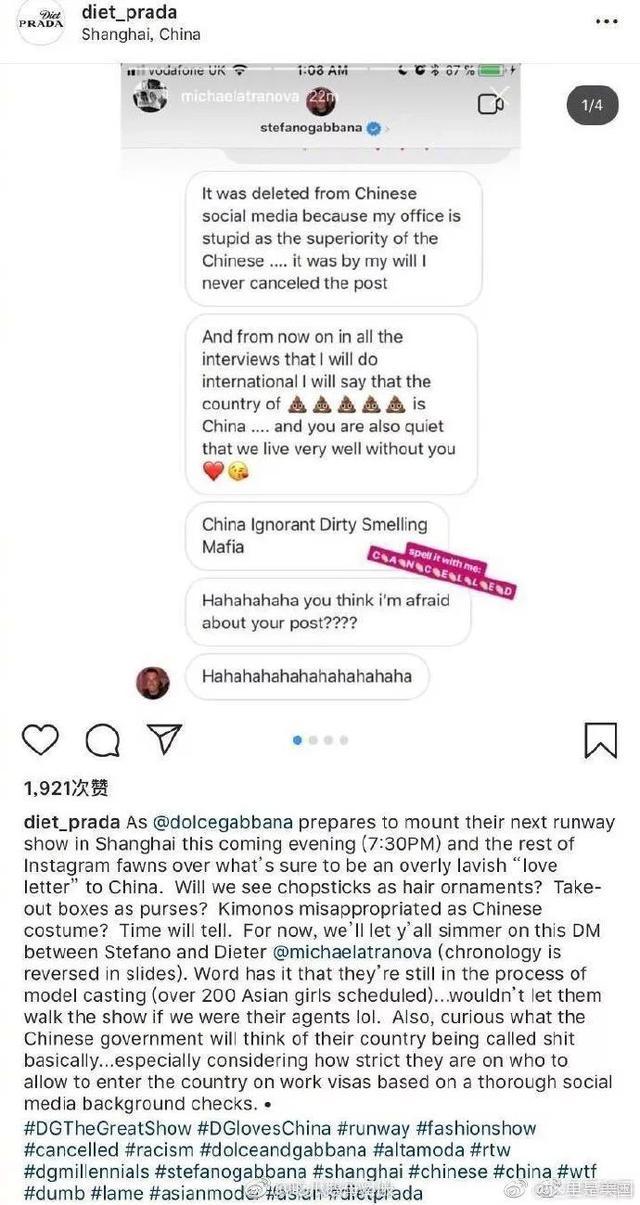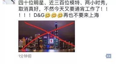 據(jù)說(shuō)很有名的服裝品牌DG(反正大叔之前沒(méi)聽(tīng)過(guò))將在今晚,在上海舉行一場(chǎng)“great show”,請(qǐng)了很多中國(guó)明星。但就在今晚大秀開(kāi)始之前,DG卻因?yàn)橐粭l有點(diǎn)惡搞中國(guó)人的視頻和一張疑似其設(shè)計(jì)師在ins辱罵中國(guó)網(wǎng)友的截屏,估計(jì)是要涼了……