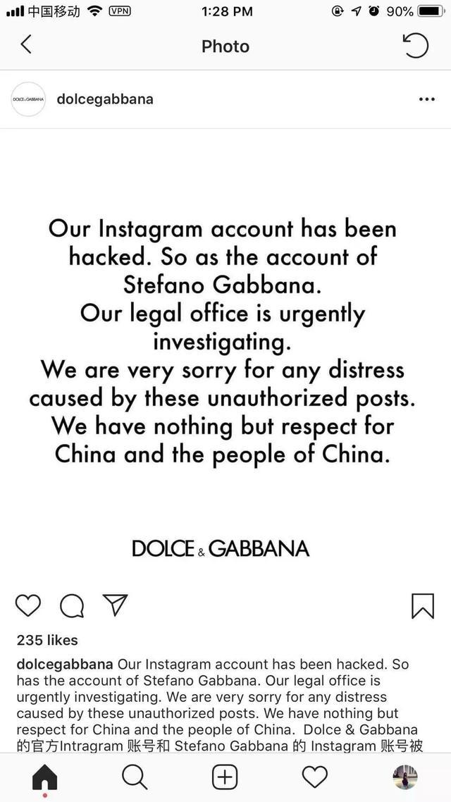 2、DG隨后也在國(guó)外網(wǎng)站發(fā)了聲明,說(shuō)官方賬號(hào)和設(shè)計(jì)師的賬號(hào)被盜了,并致歉。