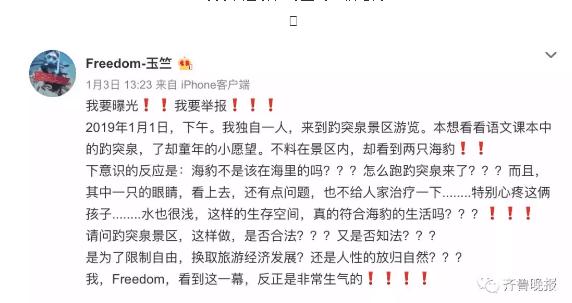 今年元旦,一名外地網(wǎng)友逛趵突泉時發(fā)現(xiàn)了海豹,便在微博上提出質(zhì)疑并“舉報”:“海豹不是應(yīng)該養(yǎng)在海里嗎?”“水也很淺,這樣的生存空間,真的符合海豹的生活嗎?”“趵突泉景區(qū)這樣做是否合法?”該微博轉(zhuǎn)載、評論和點(diǎn)贊數(shù)均較多,有的支持爆料網(wǎng)友,有的無所謂,還有的認(rèn)為海豹的豹和趵突泉的趵同音,因風(fēng)水而養(yǎng)海豹。