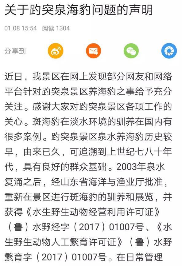好在景區(qū)很快給了答復(fù):“感謝大家對趵突泉景區(qū)各項(xiàng)工作的關(guān)心。斑海豹在淡水環(huán)境的馴養(yǎng)在國內(nèi)有很多案例。趵突泉景區(qū)泉水養(yǎng)海豹?dú)v史較早,由來已久,可追溯到上世紀(jì)七八十年代,具有良好的群眾基礎(chǔ)。”“獲得《水生野生動物經(jīng)營利用許可證》(魯)水野經(jīng)字(2017)01007號、《水生野生動物人工繁育許可證》(魯)水野繁育字(2017)01007號。”“景區(qū)專人負(fù)責(zé)海豹的喂養(yǎng),食物以新鮮海魚為主”“在飼養(yǎng)過程中如發(fā)現(xiàn)海豹的異常表現(xiàn),會第一時間請動物專家進(jìn)行會診,對其進(jìn)行積極治療,最大程度保證了健康安全的生活環(huán)境。”