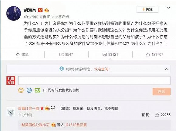 剛剛,胡海泉發(fā)微博發(fā)出10個(gè)為什么?從表面上看,這是對(duì)合作多年朋友干出這種事的惋惜,實(shí)際傳遞了兩個(gè)核心信息:“我沒吸毒,我不知情”。
