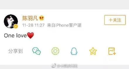 3、最關(guān)鍵的來了,一個(gè)多小時(shí)后,今天上午11時(shí)27分,陳羽凡的個(gè)人微博更新,并寫道:“One love ”。以此行為來為自己吸毒被抓的事辟謠。