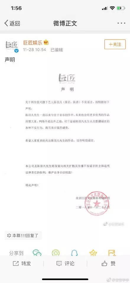 2、今天上午10點(diǎn),陳羽凡的公司@巨匠娛樂 發(fā)表聲明,否認(rèn)網(wǎng)曝關(guān)于陳羽凡的不實(shí)傳聞,稱:“陳羽凡先生一直專注于音樂創(chuàng)作中。”并表示“對(duì)于造謠陳羽凡先生以及散播謠言的各種不實(shí)行為,我司表示強(qiáng)烈譴責(zé)。”