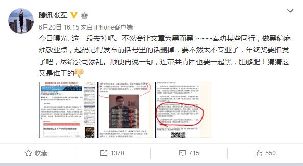 騰訊這次動(dòng)用法律武器整治黑公關(guān),也并不是空穴來風(fēng)。早在6月20日,騰訊公關(guān)張軍發(fā)微博曝光了一篇疑似黑公關(guān)的稿件,并控訴了這種黑公關(guān)行為,最后還意味深長(zhǎng)的說"猜猜這又是誰干的"。暗指今日頭條所為~