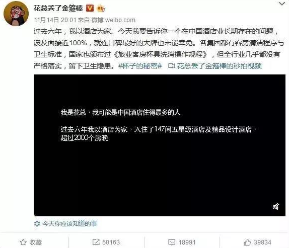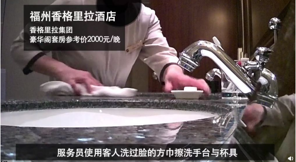 11月14日晚間,微博大V@花總丟了金箍棒 通過一段時(shí)長(zhǎng)11分49秒的視頻,曝光其近年入住的14家五星級(jí)酒店的衛(wèi)生問題。其中包括服務(wù)員用同一塊浴巾擦杯具、馬桶,使用客戶用過的方巾擦拭水杯等。