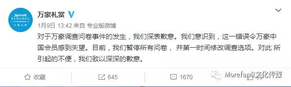1月9日上午,微博網(wǎng)友@仲舉掃地發(fā)布了一組圖片,在萬豪酒店發(fā)布的一份問卷調(diào)查中,選擇"國(guó)家"的列表里,竟赫然出現(xiàn)香港、澳門、臺(tái)灣以及西藏的選項(xiàng)。很快,這家在華擁有124家酒店的萬豪集團(tuán)被推向風(fēng)口浪尖。