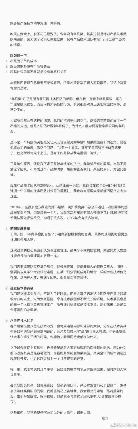 這便是羅輯思維聯(lián)合創(chuàng)始人之一快刀的“不發(fā)年終雙薪信”。這封內(nèi)部信大概有上千字,為了大家看的直觀一些,我給總結(jié)一下: