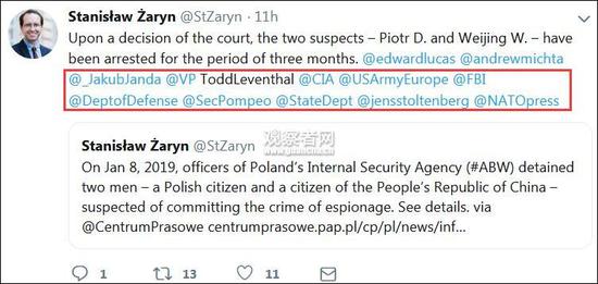 觀察者網(wǎng)注意到,波蘭國家情報(bào)機(jī)關(guān)發(fā)言人扎瑞(Stanis aw aryn)于11日在推特上宣布被捕人員身份時(shí),將美國CIA、FBI、國務(wù)院等在內(nèi)的6個(gè)部門全部@了一遍。