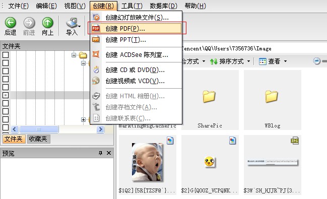3.用ACDsee打開圖片,雙擊圖片,是不是到了ACDsee“相片管理器”模式,選擇“創(chuàng)建”》》“創(chuàng)建PDF”跟著選著你放進PDF的圖片,排好順序?qū)С鯬DF,