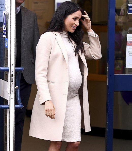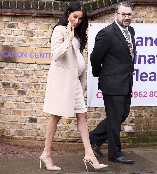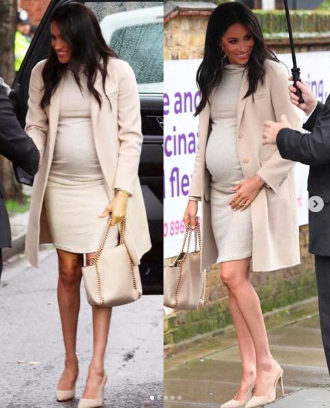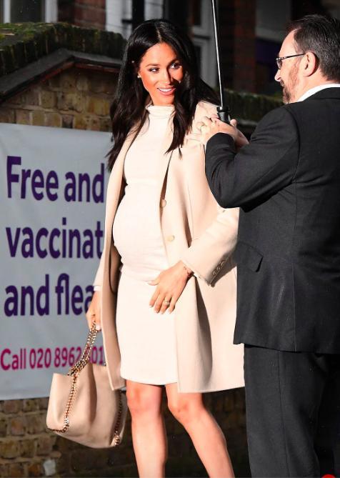 當(dāng)天倫敦溫度接近零度,還要漂著濕雨,而孕婦梅根在室外還待了蠻長(zhǎng)時(shí)間,為了保證穿著看起來(lái)不累贅,她連絲襪也沒(méi)穿,光著腳配搭的Paul Andrew高跟鞋還是夏天款的露踭涼鞋,勇氣可嘉。