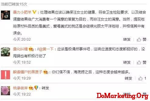 但是太平洋咖啡食品安全事件爆出后,主流媒體將事件和處理方法一并發(fā)出。令人視覺不適的視頻占據(jù)了信息主要位置,讓用戶更傾向于厭惡這一事件。在大V發(fā)聲方面,太平洋咖啡明顯做的不足。在官微發(fā)出說明后,截止發(fā)稿前,共有15個(gè)賬號進(jìn)行轉(zhuǎn)載,但對公關(guān)好評的微博主粉絲幾乎沒有過萬的,更別提有大V力挺了。