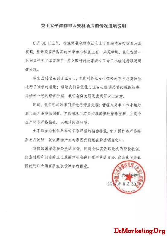 然而,海底撈食品安全事件還沒過去一周,太平洋咖啡就被爆出“在咖啡里喝到蟑螂”。而上述的太平洋咖啡發(fā)布的說明中我們也可以看到這幾點(diǎn):