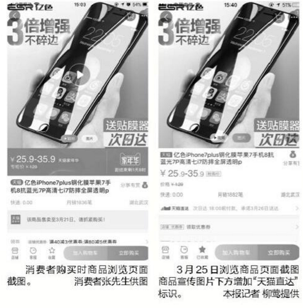 3月25日,長(zhǎng)江商報(bào)記者再次登錄張先生購(gòu)買商品的瀏覽界面,發(fā)現(xiàn)手機(jī)鋼化膜宣傳頁(yè)面左下角依然有“次日達(dá)”標(biāo)示,而且多了“天貓直達(dá)”字樣,而對(duì)比此前張先生發(fā)給記者的截圖上可以看到,這個(gè)“天貓直達(dá)”的標(biāo)識(shí)是沒(méi)有的。