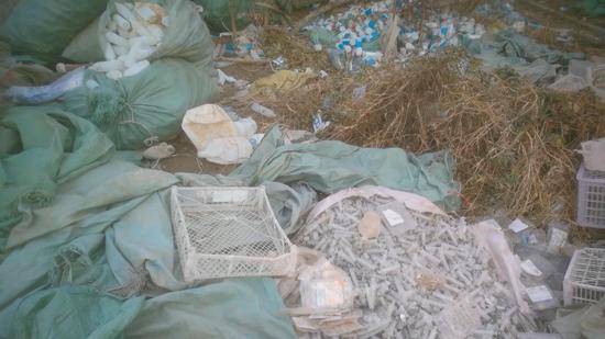 除了輸液瓶、輸液袋,這里還有少量輸液管、一次性注射器等醫(yī)療廢物。