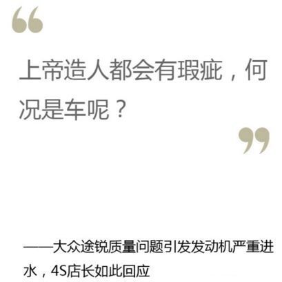 然而也并非所有企業(yè)都如此,以去年315晚會為例,央視曝光了大眾途銳暗藏缺陷,發(fā)動機進(jìn)水嚴(yán)重的問題,報道中,有4S店店長在回應(yīng)消費者維權(quán)時稱,“上帝造人都有瑕疵,何況是車?”