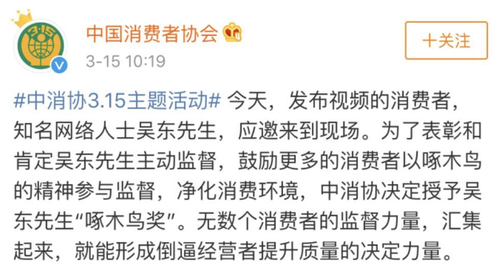 花總的微博視頻成功的揭開了行業(yè)亂象,引起了極大的反響。今日,據(jù)微博@中國消費者協(xié)會消息,花總(吳東)被授予“啄木鳥獎”,以此鼓勵更多的消費者以啄木鳥的精神參與監(jiān)督,凈化消費環(huán)境。