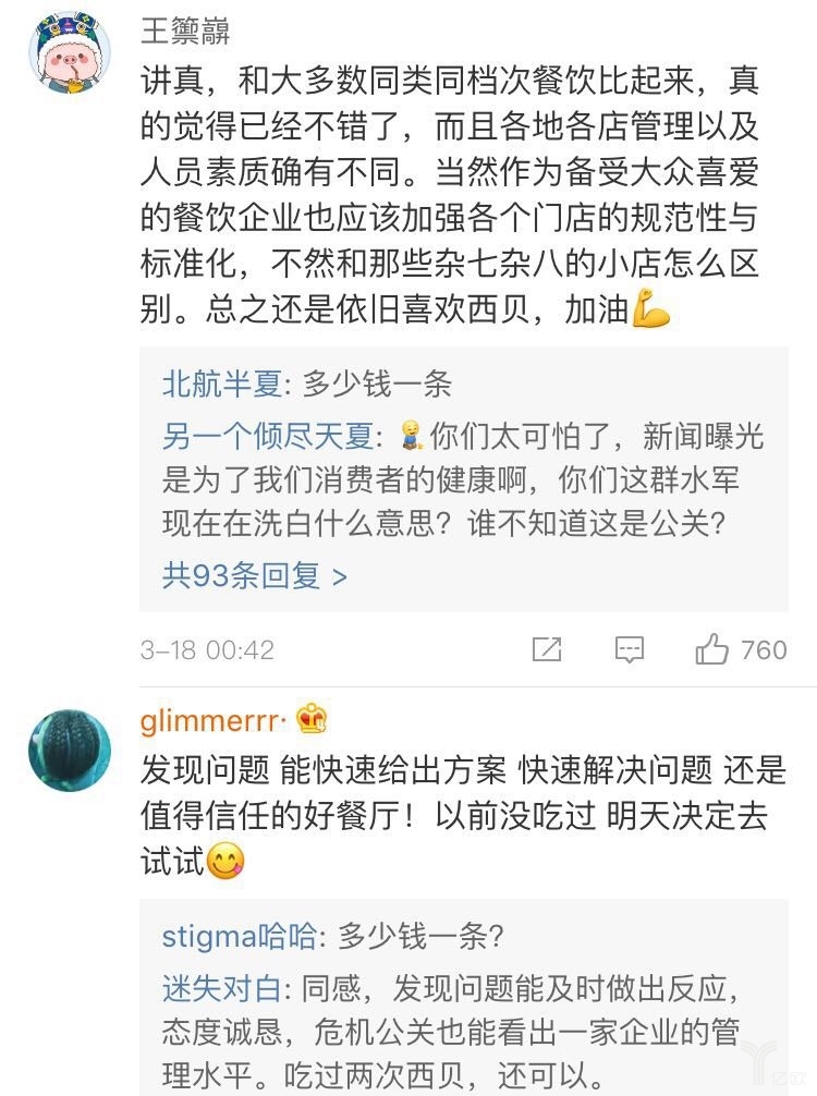 不能怪消費者不買賬,近些年類似事件太多,出了問題,就道歉聲明實在顯得太過單薄。相比之下,西貝處理的方式顯得更有誠意。事件曝光當天,西貝官方微博就在道歉聲明中深刻反省,強調(diào)“干凈衛(wèi)生是餐飲的本分”,詳細解釋了對曝光出的問題采取的相應(yīng)措施,開放廚房給公眾參觀。西貝副總裁也在個人微博中道歉。西貝被曝光的都是后廚操作不規(guī)范的問題,并沒有外婆家那么嚴重。再加上西貝一直都采取“明廚亮灶”的形式,顧客口碑較好,公眾輿論都表示支持,認為“西貝比起其他品牌后廚已經(jīng)很干凈了”。當然道歉聲明下清一色的好評讓人不禁懷疑其真實性,部分消費者似乎也因此對西貝好感下降。但由于西貝及時得體的危機公關(guān),品牌在這次食安危機中并未受到太大損害。