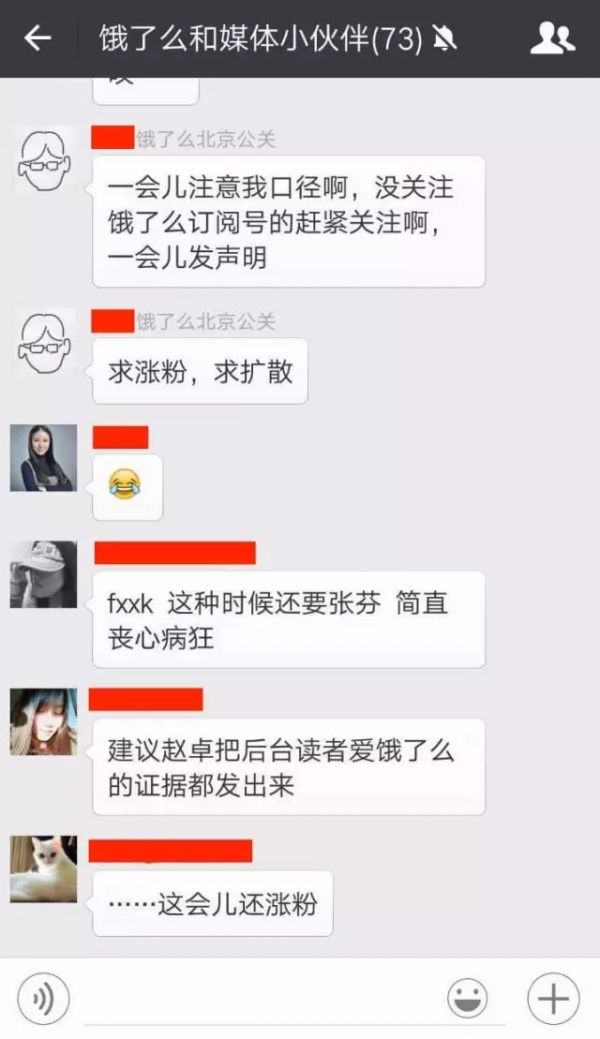 當(dāng)所有人都以為餓了么公關(guān)部急瘋了的時候,網(wǎng)上流傳出一張餓了么公關(guān)部小伙伴的群聊截圖,餓了么北京公關(guān)正在樂此不疲地“求漲粉”,號召大家趕緊關(guān)注餓了么訂閱號。