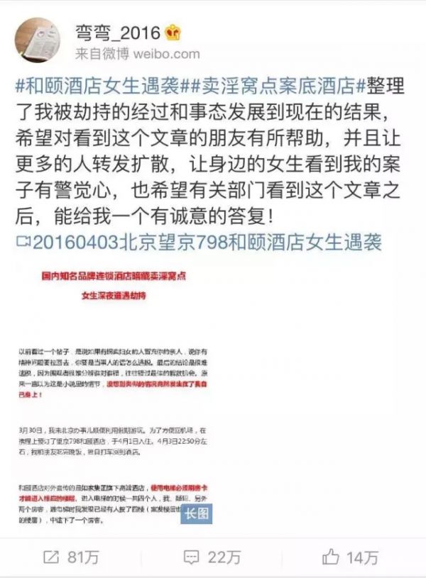 4月5日晚,ID為@彎彎_2016的女子聲稱在北京和頤酒店入住時遭遇陌生男子拖拽劫持,而酒店和警方都不作為,并暗指如家旗下的和頤酒店暗藏賣淫窩點(diǎn)。原微博的轉(zhuǎn)評已達(dá)上千萬。