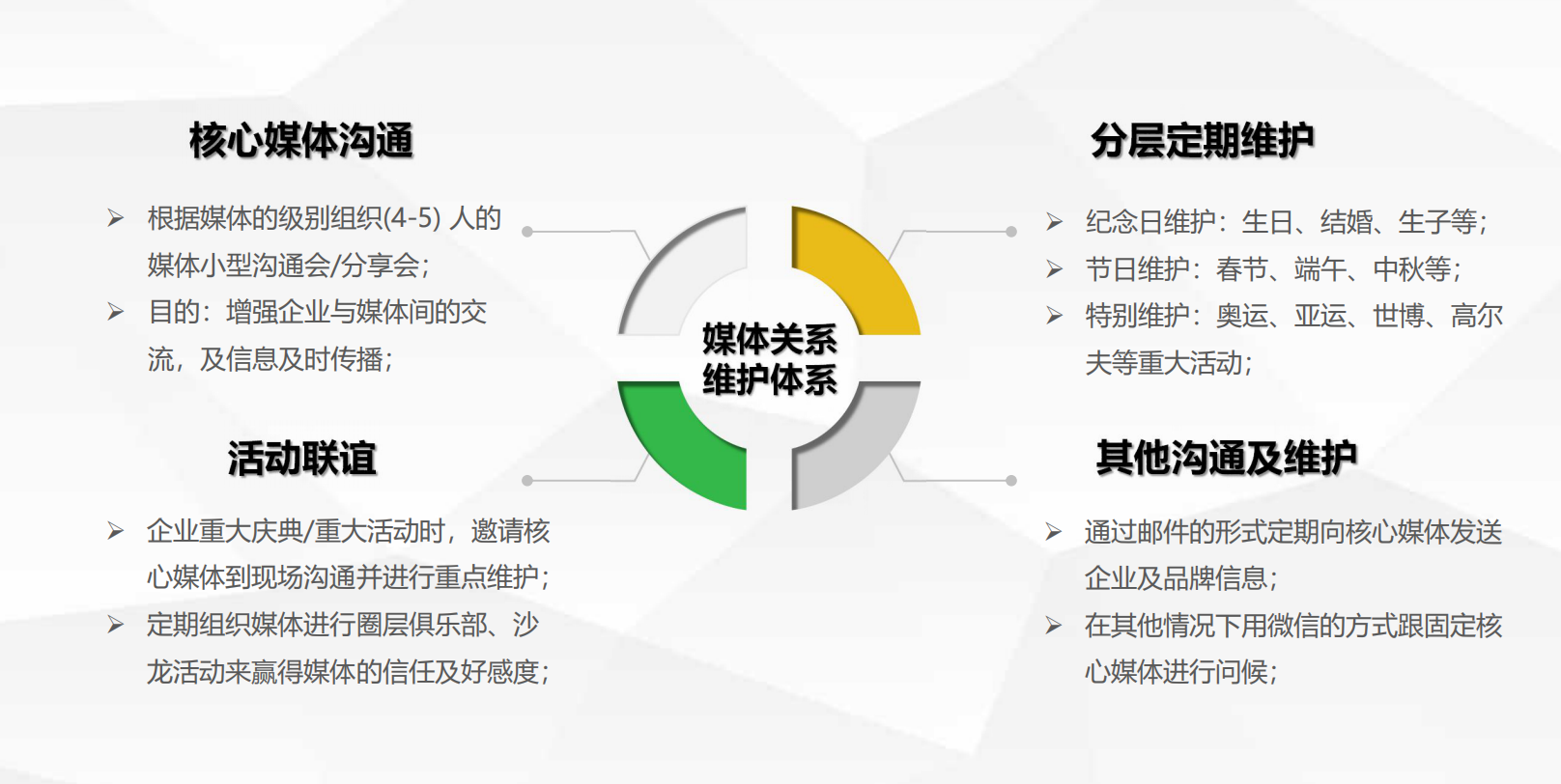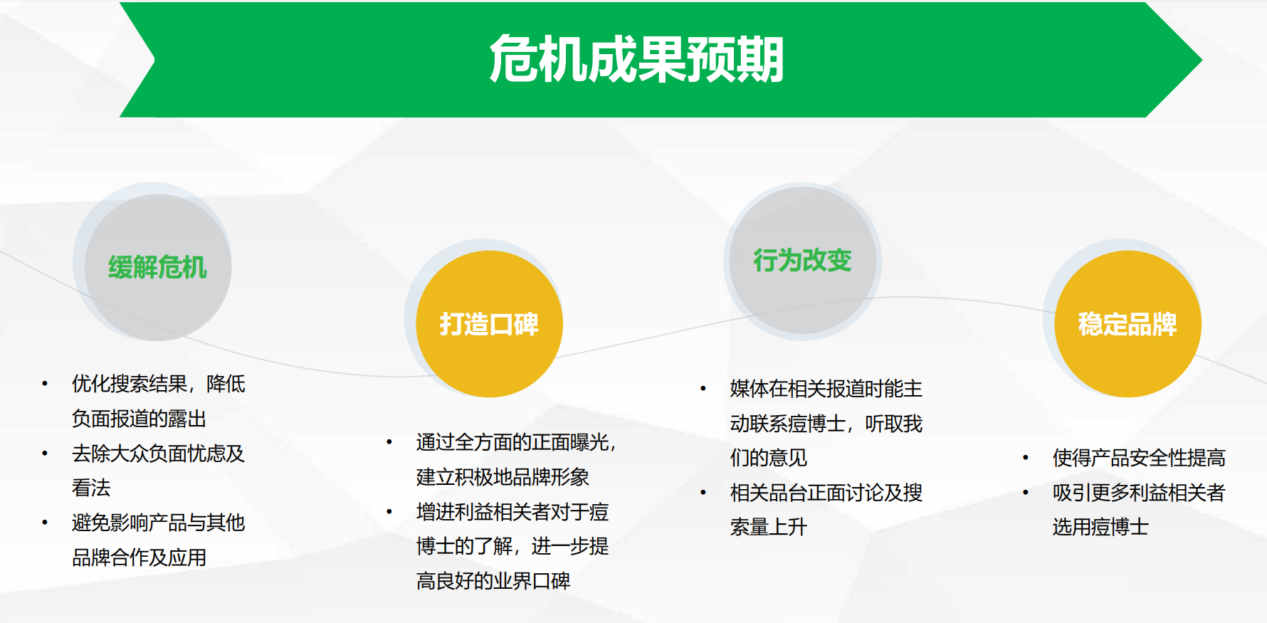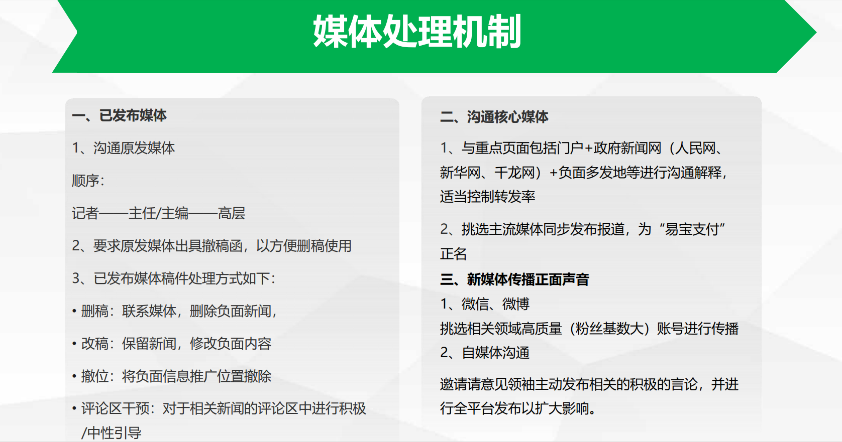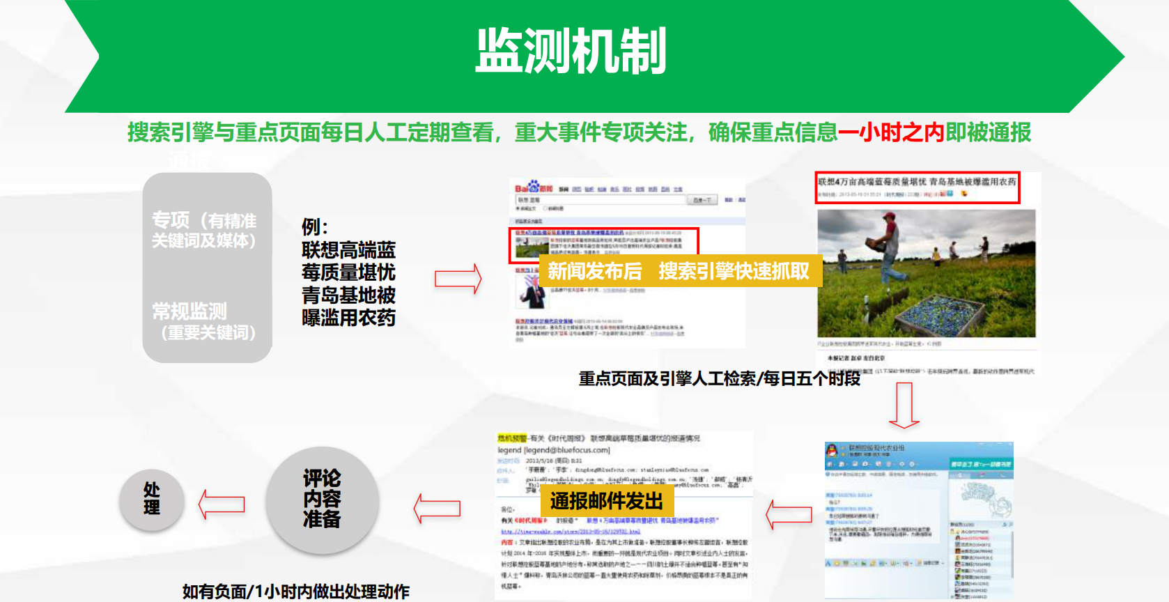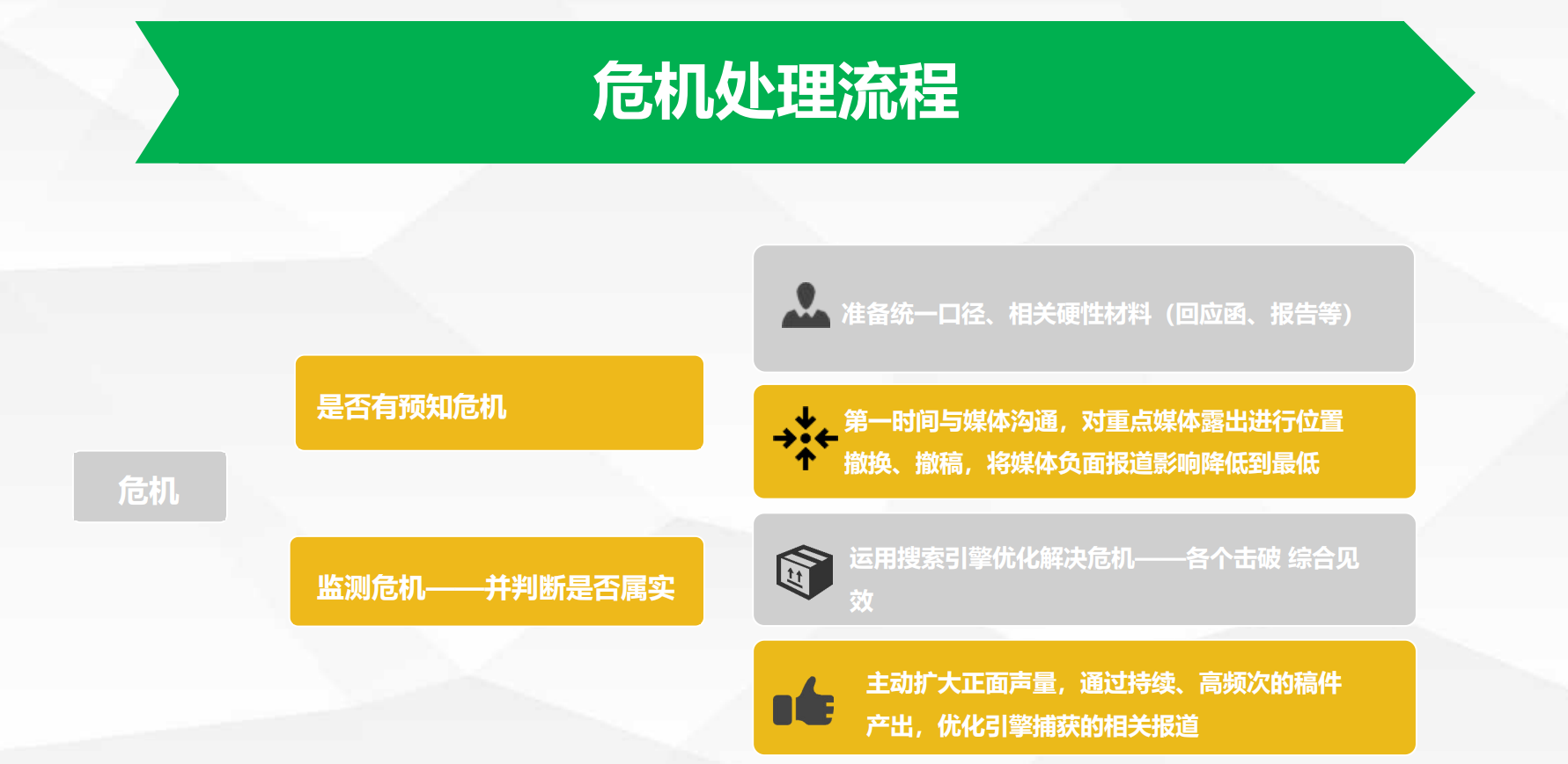簡(jiǎn)單了說(shuō),企業(yè)做危機(jī)公關(guān)的時(shí)候,無(wú)非就這么幾個(gè)點(diǎn),負(fù)面爆發(fā)——收集負(fù)面——聯(lián)系媒體——正面信息壓制——負(fù)面信息刪除等,本人之前又給一家公司做過(guò)相關(guān)的處理框架,分享出來(lái)和大家探討下。