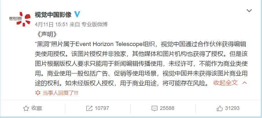 首先是視覺中國,在事發(fā)后兩天內(nèi)連發(fā)3份聲明:第一份聲明主旨為“黑洞”照片有部分版權(quán),無商業(yè)用途版權(quán);