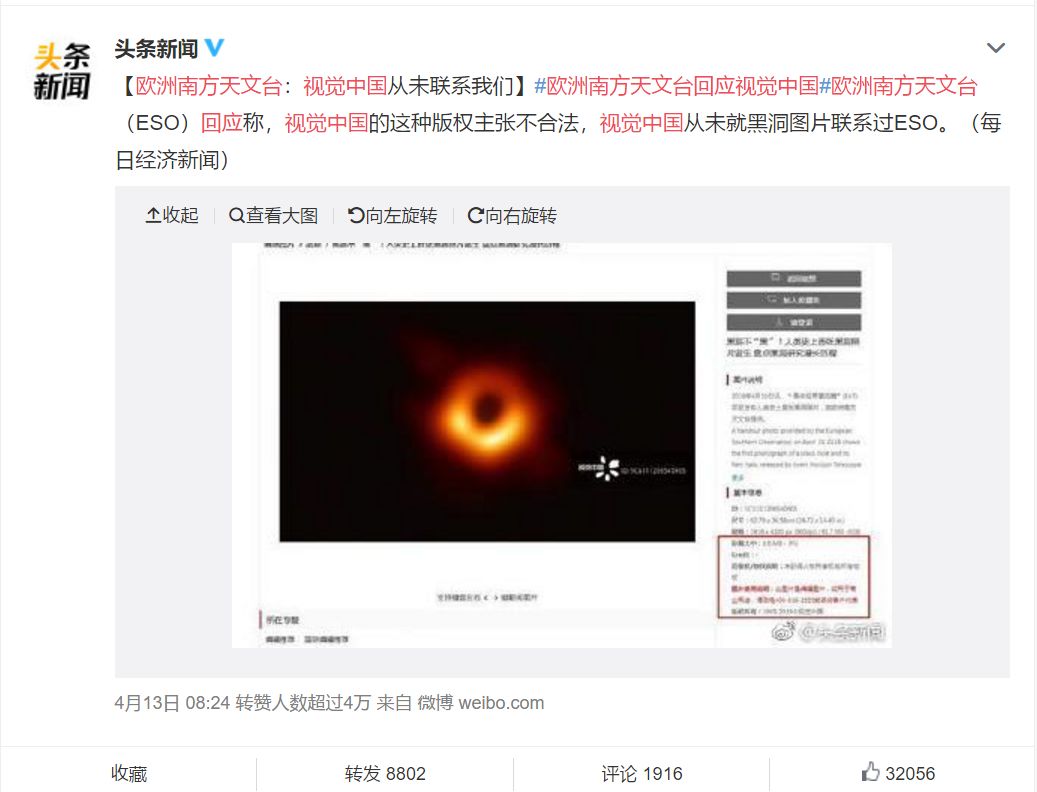 上周,最轟動(dòng)的全球性事件無疑是“人類歷史上首張黑洞照片公布”。“黑洞”真容問世已經(jīng)過去4天了,如果評(píng)選一家最不想看到“黑洞”的公司,那一定非視覺中國莫屬。