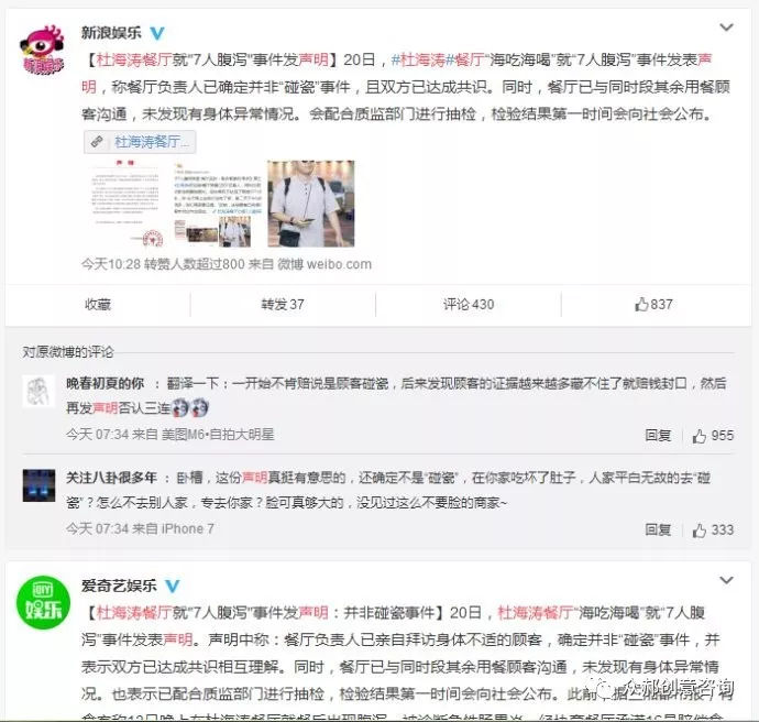 但后續(xù)因餐廳負責人的回復不當以及后續(xù)的兩次推脫,導致食客將事件曝光至微博@杜海濤直接引起輿論的嘩然,公眾質疑和聲討,后續(xù)輿論自由發(fā)酵導致杜海濤餐廳及杜海濤本人聲譽嚴重受損。
