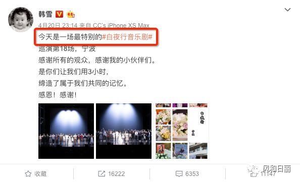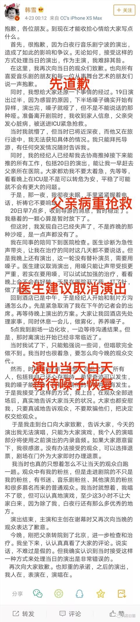 演出當(dāng)晚(4月20日),韓雪發(fā)文稱“今天是一場最特別的白夜行音樂劇”,僅用感恩和感謝來回應(yīng)當(dāng)晚的爭議點(diǎn)——演員聲帶出問題,就用錄音帶來替代現(xiàn)場演唱。