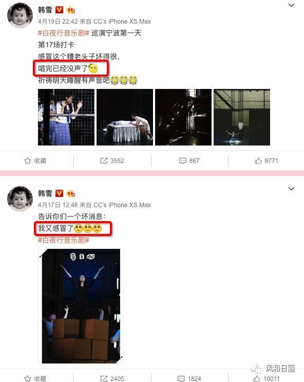 在此之前,韓雪因為身體原因,嗓子早就出現(xiàn)了問題,她每場演出結(jié)束后都會微博打卡,既然身體已經(jīng)預(yù)警了,為什么不及時止損?