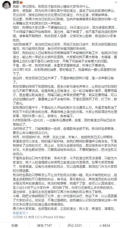 4月23日凌晨,韓雪自己終于在微博發(fā)表長(zhǎng)文解釋了,說(shuō)19日演出完,嗓子就啞了。隨后收到家人信息,父親突發(fā)心臟病,被送進(jìn)ICU緊急搶救。經(jīng)歷一夜未眠后,20日失聲,才無(wú)奈走到臺(tái)口向大家致歉,并告知演出無(wú)法演唱。最后再次向大家致歉,并承諾之后的演出,人在,表演在,演唱在。