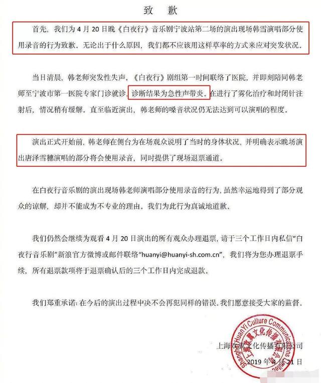 這里回放幾個(gè)關(guān)鍵點(diǎn):一是韓雪在19日晚演出前夜突發(fā)急性聲帶炎導(dǎo)致發(fā)聲困難, 4月20日,音樂(lè)劇《白夜行》寧波場(chǎng),主辦方在開(kāi)場(chǎng)時(shí)——而不是開(kāi)場(chǎng)前將此情況告知觀眾并現(xiàn)場(chǎng)道歉,承諾可以退票。