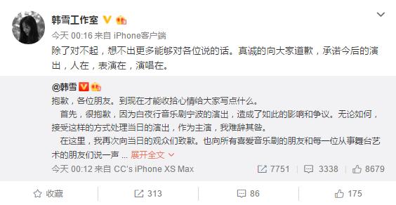 我們看看韓雪是怎么解釋在演出中播放演唱部分錄音的,“當(dāng)時(shí)也真的只想著怎么不讓當(dāng)天的觀眾白跑一趟。我當(dāng)時(shí)就想著,我唱不了歌,但可以認(rèn)真地演戲,至少這3小時(shí)不讓大家白來(lái)。我確實(shí)認(rèn)識(shí)到當(dāng)時(shí)接受這樣一種方式來(lái)處理當(dāng)日的演出是非常錯(cuò)誤的。”