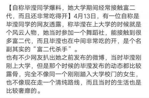 更有自稱是畢瀅的同學爆料稱,畢瀅在上大學的時候男生緣就很好,是個風云人物,而且接觸的都是富二代,是一個名副其實的“富二代殺手”。