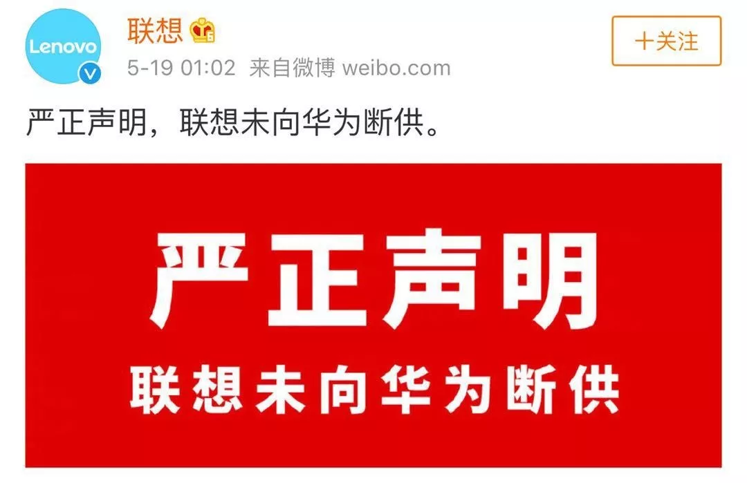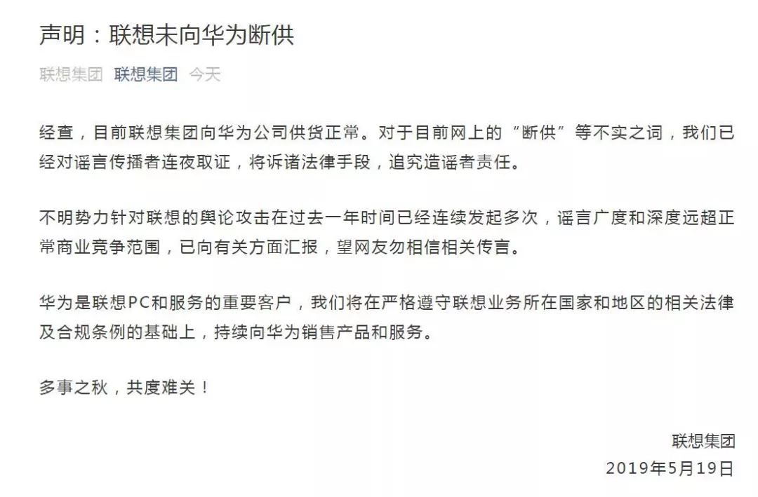 5月19日1時許,聯(lián)想發(fā)布嚴(yán)正聲明稱,聯(lián)想未向華為斷供,目前聯(lián)想集團向華為公司供貨正常。