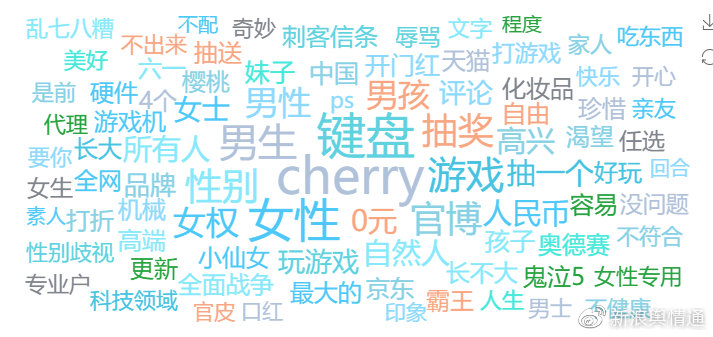關鍵詞云中,“CHERRY”“鍵盤”“抽獎”是事件爆發(fā)的導火索;“女性”“男性”“女權”“性別歧視”等詞表示性別平等是話題爭議焦點;“官博”“不配”“辱罵”等有關CHERRY官博的言論和態(tài)度引發(fā)輿論評價及關注。