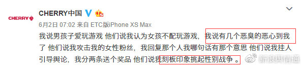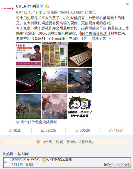 6月1日10時,為了迎合六一兒童節(jié),外設大廠CHERRY在微博發(fā)起抽獎活動,因為抽獎文案中特指了中獎用戶為“男性”,一個素人妹子問的一句“女孩不配玩游戲”成為這場網絡輿論大戰(zhàn)的導火索。素人妹子的這條評論被贊了五千多次,由此網友開始質疑CHERRY歧視女性。