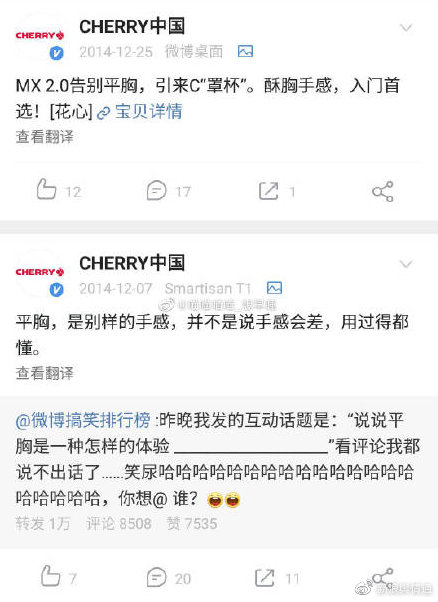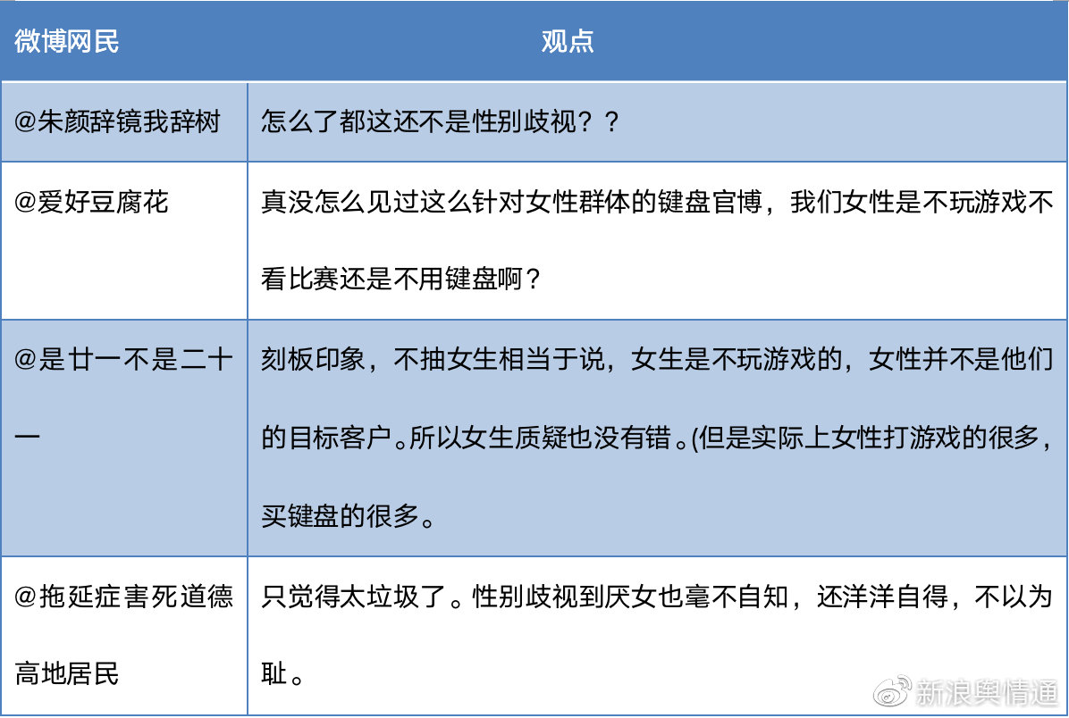 @CHERRY中國發(fā)起的鍵盤抽獎僅限“男性”,引發(fā)輿論不滿,網友認為這種“只有男生玩游戲”的暗示,顯然是一種性別刻板印象。同時,一些網友翻出公司以往營銷微博,認為其“物化女性、歧視女性”的風格更是一以貫之。
